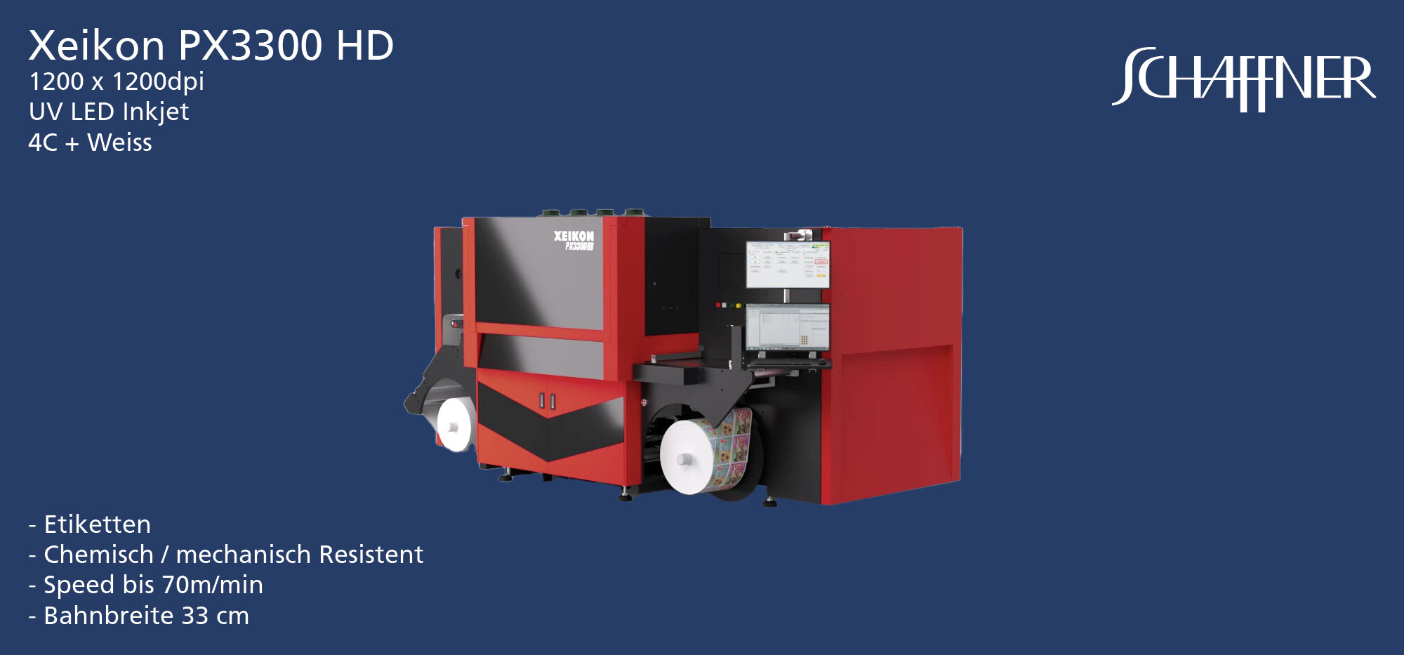 Die UV Inkjet Geräte von Xeikon eignen sich hervorragend für die Produktion von Etiketten. Dank der UV Inkjet Technologie kann eine grosse Bandbreite von Substraten auf Kunstoffbasis ohne Primer verarbeitet werden. Die gedruckten Etiketten weisen einen glänz auf und sind ohne weitere Nachbehandlung weitgehend resistent gegen mechanische und chemische Einflüsse. So eignen sie sich z.B. für selbstklebende Etiketten auf Getränke, Öl oder Shampoflaschen, aber auch für Parfüm oder Nagellackentferner. Also alles, was normalerweise eine Druckfarbe angreift und das Druckbild zerstört. Diese Geräte können für Schmalband (22cm) oder Breitband Produktionen (33cm) konfiguriert werden.